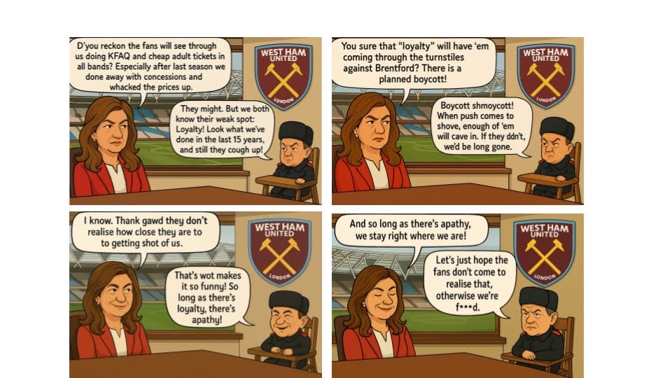 To make sure that message hit home, supporters groups Hammers United and Crossed Hammers have called for Monday night's boycott. The club have responded by slashing ticket prices for general admission tickets by around two thirds for adults and offering kids' tickets for a quid.