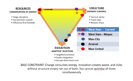 On the Strategic Constraint Triangle, West Ham behave as if they were a high-resource, high-evolution club, while in reality they are a mid-resource, under-structured one. That mismatch – between how the club acts and what its operating limits can actually sustain – is the root cause of decline. It is not a moral failure or a lack of courage; it is a structural mismatch between behaviour and capacity. The outcome is predictable: entropy rises, capacity declines as 𝑘 falls.