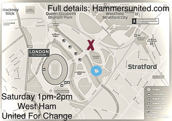 The protest, staged by supporters group Hammers United under the banner of 'United for Change' will be held this afternoon just a few hundred yards from the London Olympic Stadium.